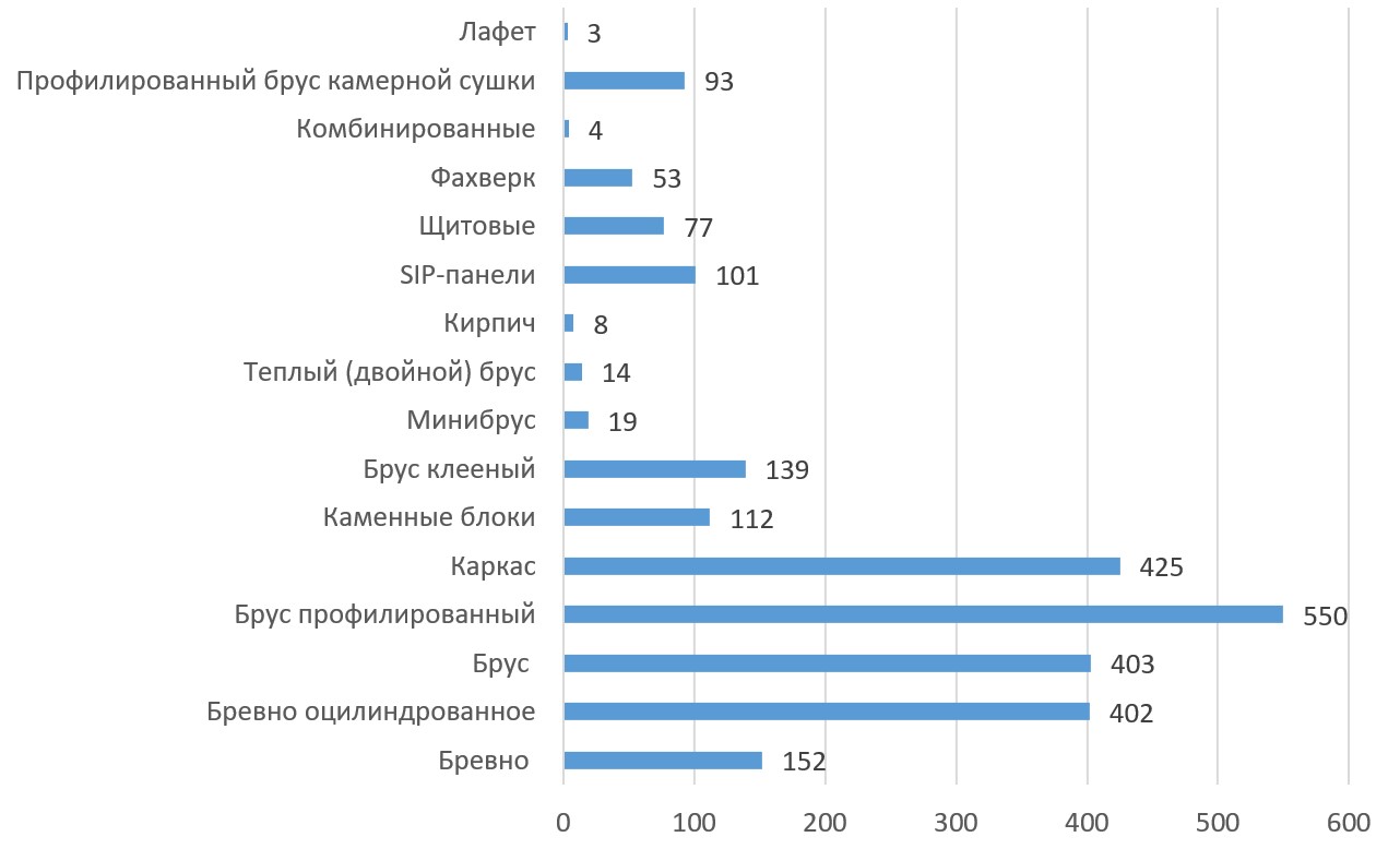 На диаграмме представлены заявки на все типы построек (от беседок до гостиниц) с распределением по технологии / типу материала. Максимальный спрос демонстрирует профилированный брус естественной влажности, каркасная технология — вторая по популярности. Брус обрезной/строганый и оцилиндрованное бревно разделяют третье место.