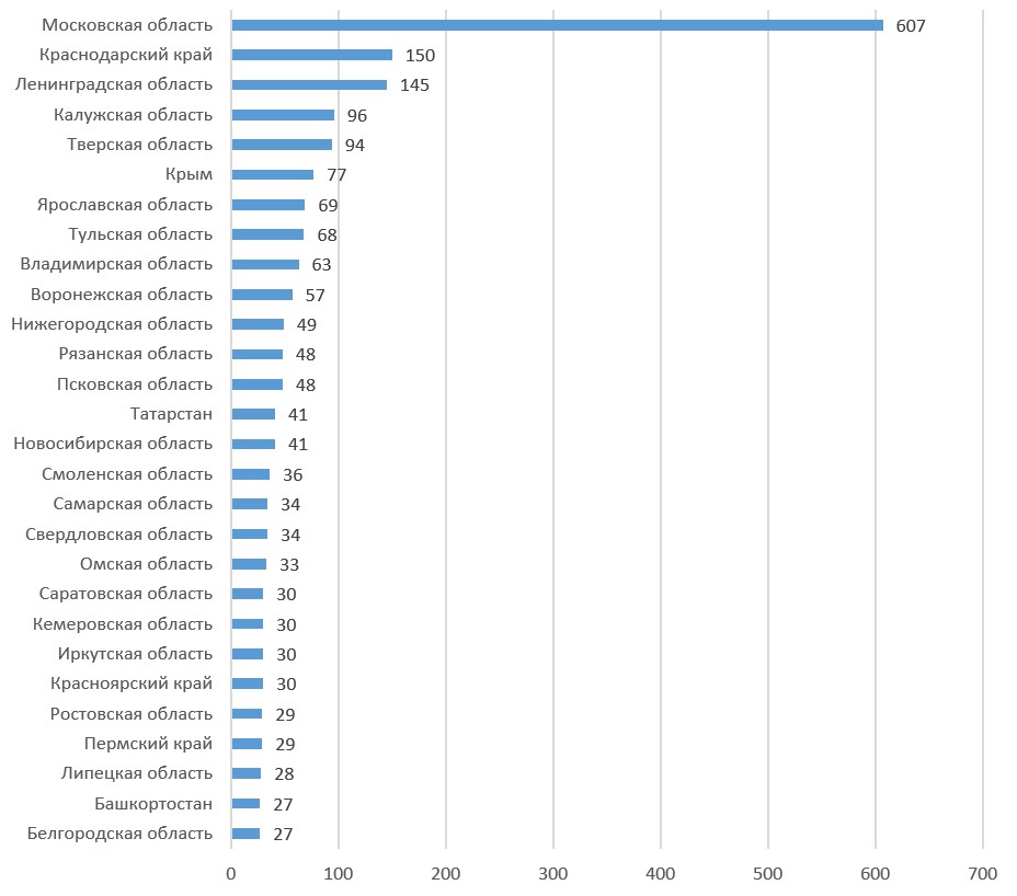 На диаграмме можно увидеть число заявок со всех регионов, доля которых в структуре заявок в I квартале не менее 1%. Совокупная доля этих 28 регионов — 74,3% от общего числа заявок. Оставшиеся 25,7% приходятся на 52 региона.